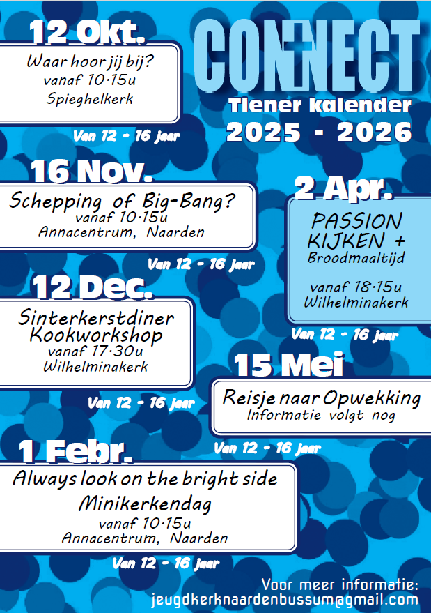 Jeugdwerk Hoe jong of oud je ook bent, je bent van harte welkom bij de activiteiten die wij als gemeente voor jou organiseren. De coördinatie van het jeugdwerk is in handen van de jeugdraad, in samenwerking met onze predikanten. We werken nauw samen met de jeugdwerkers in de Wilhelminakerk en Spieghelkerk in Bussum. Wij hebben vrijwilligers die zich inzetten voor de crèche en de overige jeugdactiviteiten. Ook je ouders worden bij deze activiteiten betrokken. Met elkaar vormen we een gezellige club! We vinden het leuk om je te zien! ![]() ![]() Kinderopvang Krijg je lastig kinderoppas als je naar de kerk wilt komen? Geen probleem. Iedere zondag is er tijdens de kerkdienst Kinderopvang voor kinderen van 0-4 jaar. Bij diensten in de Grote Kerk in het Annacentrum, bij diensten in de Witte Kerk aldaar. Leidster is Irma Rapati. Zij heeft het diploma HBO-pedagogiek en doet dit werk op vrijwillige basis. Je kunt je kinderen vanaf 9.30 uur brengen. Natuurlijk noteert Irma altijd je naam en je mobiele telefoonnummer. Zo nodig krijg je tijdens de kerkdienst een berichtje. Je kinderen komen aan het einde van de dienst weer terug. Kortom, zondags ontzorgen ten top! Leidster: Irma Rapati, irma@rapatien.nl, tel.: 06 199 423 71 Kindernevendienst Je kinderen stapsgewijs meenemen in hun spirituele ontwikkeling is best een klus. Gelukkig hebben we daar al jaren veel ervaring in. Tijdens een deel van de kerkdienst is er Kindernevendienst voor kinderen van 4-12 jaar. Bij diensten in de Grote Kerk in het Annacentrum, bij diensten in de Witte Kerk aldaar. Zij horen dan in hun eigen ruimte Bijbelverhalen – meestal passend bij de lezingen van die dienst in de kerk, praten daarover en er is tijd voor knutselen en spelen. Thuis of later in de week kun je dus makkelijk met je kinderen nog eens terugkomen op de essentie van dat verhaal op zondag. Interesse? Kom een keer langs of neem contact op. Jeugd: er is meer..... In de kerkdiensten is er altijd aandacht voor de kinderen, met wie afscheid neemt van de Kindernevendienst wordt voor de zomervakantie een “overstapdienst”georganiseerd. Voor kinderen en jongeren is er in de zomer een uitje, in september een startkamp. En we doen mee met Sirkelslag Kids en Young (https://jop.nl/themas/missionair-jeugdwerk/sirkelslag). |